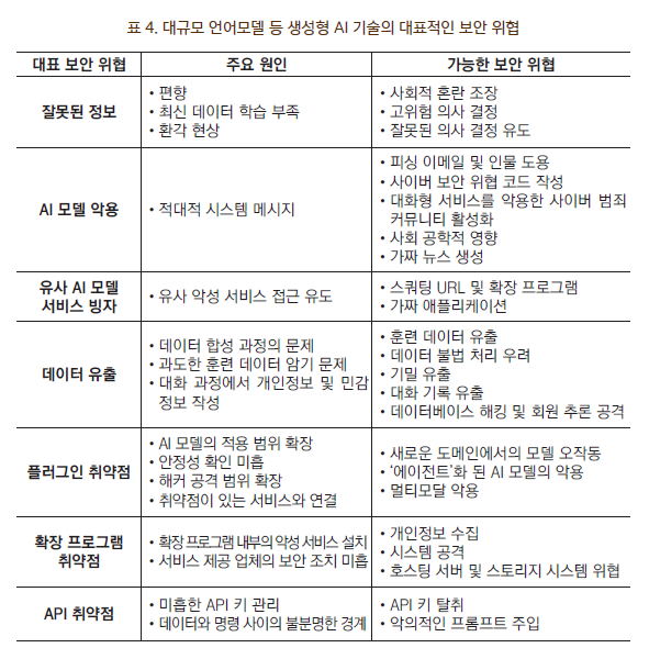정리된 표와 같이 생성형 AI 모델의 잠재적인 위험과 보안 문제를 정의하고 있습니다. AI 모델의 편향, 최신 데이터 학습 부족, 환각 현상과 같은 잘못된 정보 생성등 원인과 현재 논의되고 있는 여러 보안위협이 잘 정의되어 있습니다.